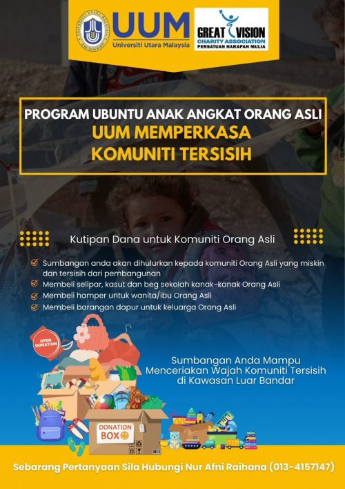 Program ini dianjurkan oleh pelajar Kursus SSWSK2153 Perancangan dan Pembangunan Komuniti, SAPSP, dengan kerjasama Great Vision Charity Association dan Persatuan Kerja Sosial UUM. Program akan berlangsung di Perkampungan Orang Asli Lubuk Legong, Baling, Kedah pada 26–27 Disember 2025.